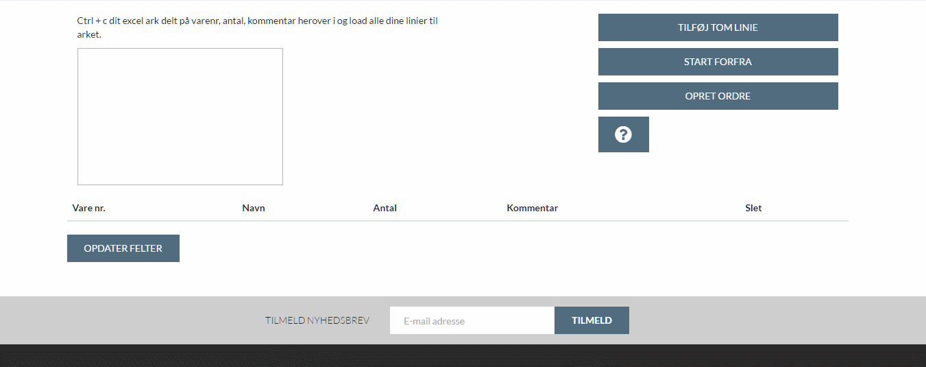 CRTL+C dit excel ark fordelt på 3 kolonner med A = Varenr., B = Antal og C = Kommentar ind i dette felt med CRTL+V - herefter vil dine varelinjer automatisk blive hentet og du kan tilføje alle til kurv på én gang